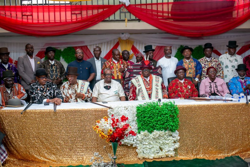 Aiteo’s team with elders of Opu-Nembe Kingdom after distribution of relief materials to residents following the oil leak