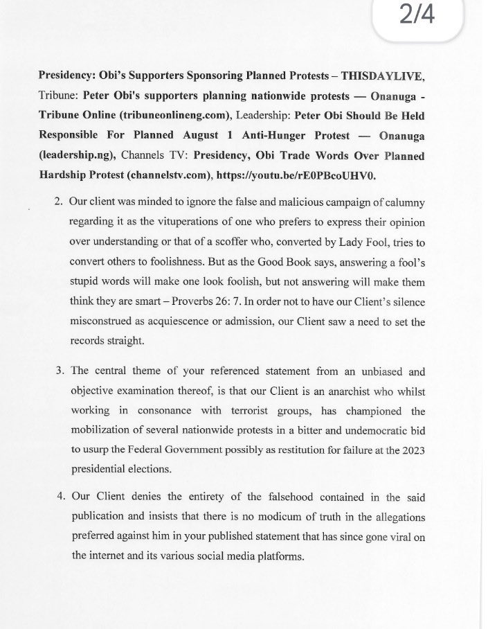 The Labour Party (LP) presidential candidate, Mr. Peter Obi, has served notice to file a lawsuit against President Tinubu’s media aide, Bayo Onanuga, for saying that he (Obi) should be held responsible if anarchy befalls Nigeria arising from the planned nationwide protest over hunger and economic hardship in the country.
