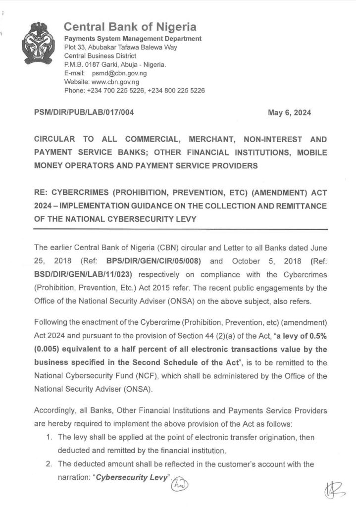 The Central Bank of Nigeria (CBN), on Monday, issued a circular dated May 6, 2024 to all commercial, merchant, non-interest and payment service banks as well as mobile money operators and payment service providers to start deducting 0.5% (half of a percent) as cybersecurity levy on all electronic transactions carried out in the country.