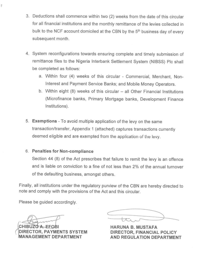 The levy is to be paid by the originator of the electronic transaction and deducted by the financial institution. The deducted amount shall be reflected in the customer’s account with the narration: “Cybersecurity Levy.”