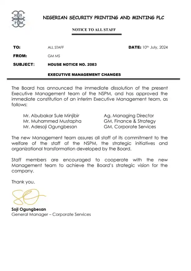 The Central Bank of Nigeria (CBN) has dissolved the executive management team of Nigerian Security, Printing and Minting Plc with immediate effect.