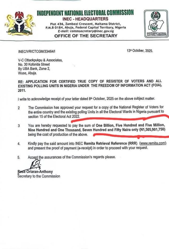 According to a letter dated October 13, 2025, and signed by the Secretary to the Commission, Rose Oriaran-Anthony, INEC acknowledged receipt of the firm’s earlier correspondence dated October 8, 2025, seeking access to the documents.