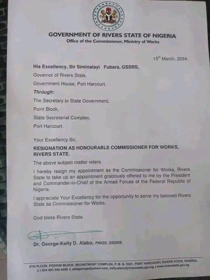 The Rivers State Commissioner for Works, George-Kelly D. Alabo, has resigned from Governor Siminalayi Fubara’s cabinet, and taken up a Federal government appointment.