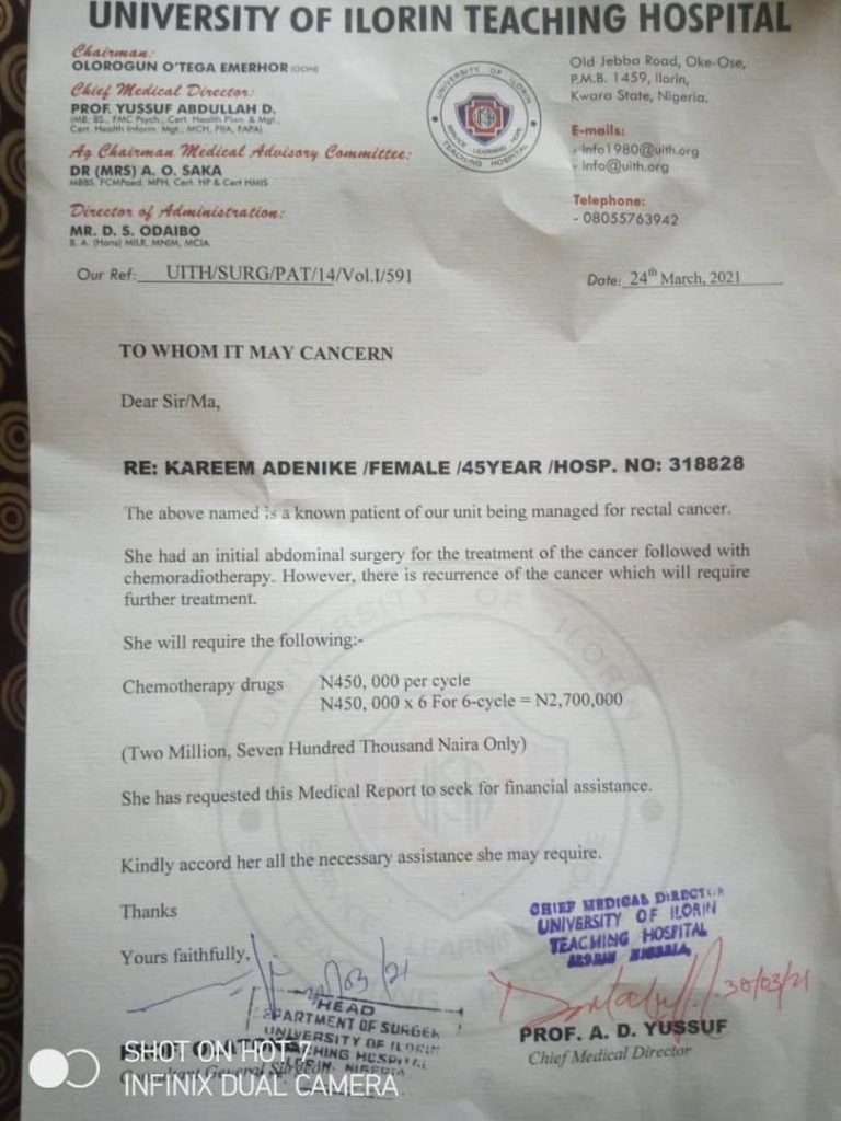 The University of Ilorin Teaching Hospital (UITH) has confirmed that Mrs. Kareem Adenike would need to undergo further surgery, to treat her ‘Rectal Cancer’ condition.