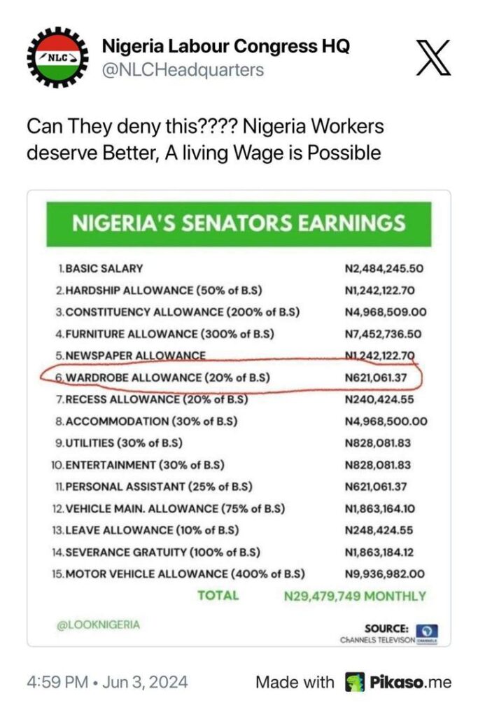 Shehu detailed that the total monthly entitlement of each Senator includes a basic salary of N168,866.70; motor vehicle fuelling and maintenance allowance of N126,650.00; personal assistant allowance of N42,216.66; domestic staff allowance of N126,650.00; entertainment allowance of N50,660.00; utilities allowance of N50,660.00; newspapers/periodicals allowance of N25,330.00; wardrobe allowance of N42,216.66; house maintenance of N8,443.33; and constituency allowance of N422,166.66.