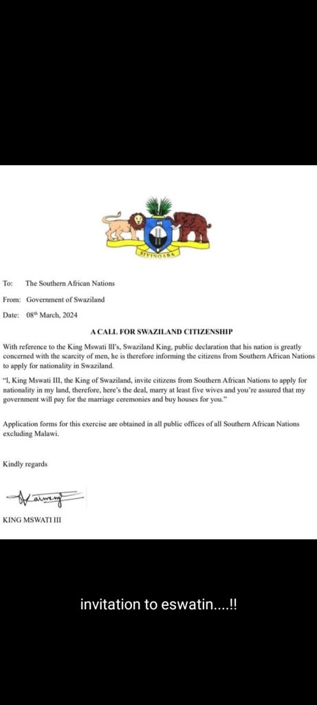 On February 8, 2024, in a memo to Southern African Nations titled “A Call for Swaziland Citizenship”, King Mswati wrote: