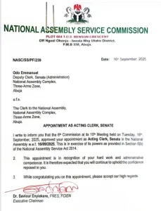 The Commission, at its 10th meeting in Abuja, approved the appointment of Odo to act in the position of Clerk of the Senate, pending substantive decisions by the NASC acting in concert with National Assembly leadership (both political and administrative wings).