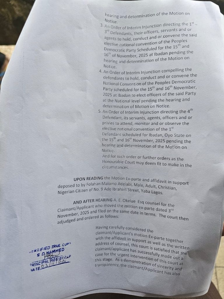 Adelabi asked the court for an interim injunction to restrain the defendants from “truncating, frustrating, the Guidelines, Timetable and Schedule of Activity and/or disrupting, preventing and or stopping the conduct of the Scheduled National Convention of the Peoples Democractic Party (PDP) fixed for the 15th and 16th November, 2025 at Ibadan to elect officers of the said party at national pending the hearing and determination of motion on notice”.