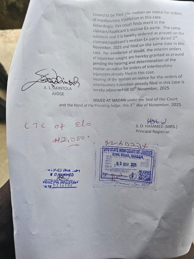 The certified true copy of the enrolment of order was signed by the Principal Registrar of the Oyo State High Court, Mrs. S. O. Hammed, and issued at Ibadan under the seal of the court on November 3, 2025.