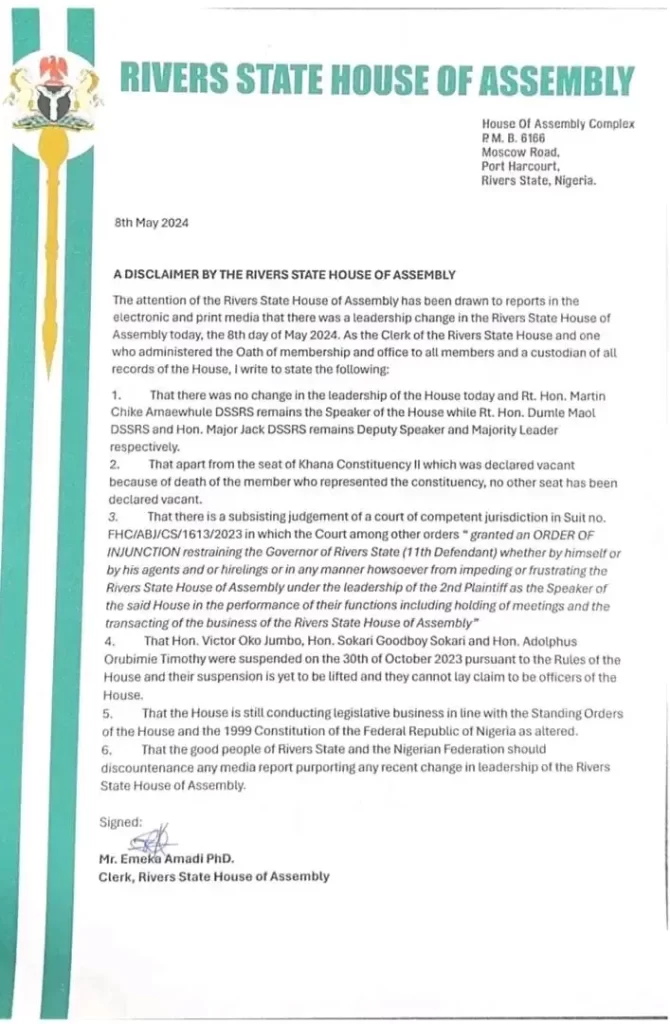 Amadi insisted that the Speaker of the Rivers State House of Assembly remains Martin Amaewhule.