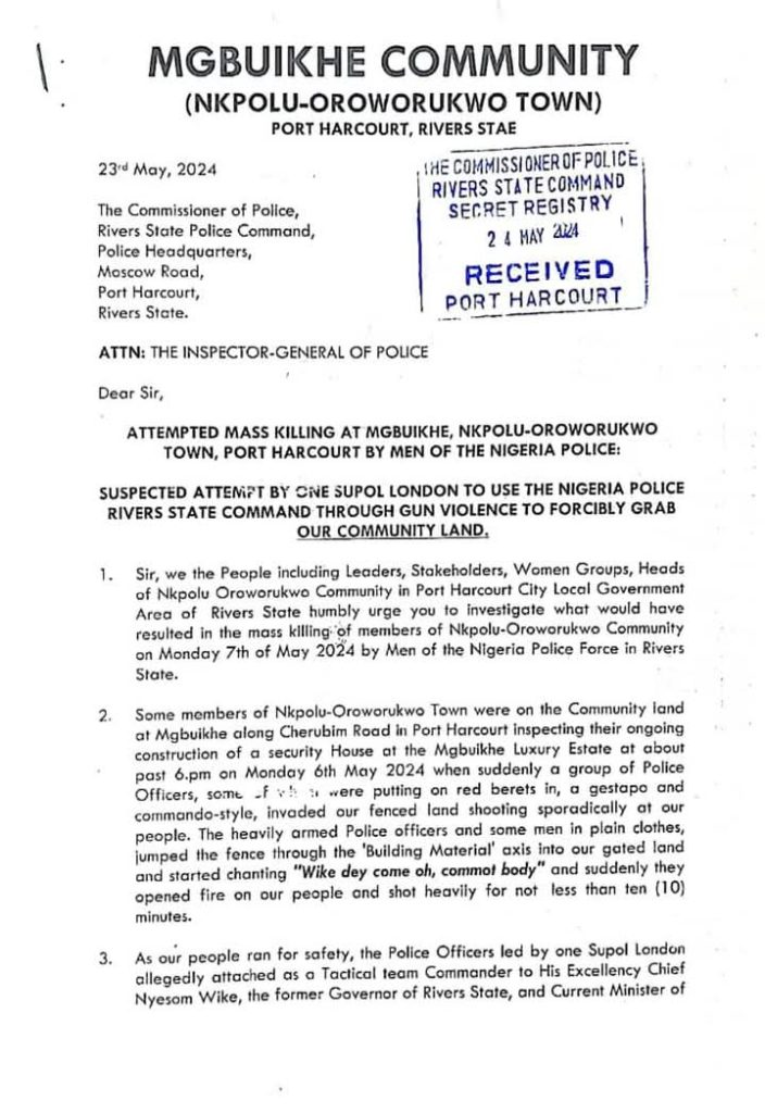 They also point out that a lawsuit filed by a separate group claiming ownership of the land is still pending before the Rivers State High Court, yet armed security personnel remain stationed on the property while construction activities reportedly continue under police protection. The community insists that maintaining police presence on a disputed property under litigation amounts to “a desecration of the rule of law.”