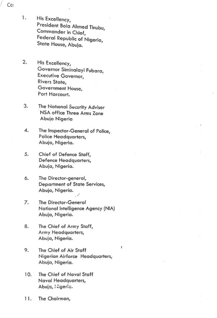 Copies of the petition were also sent to the National Security Adviser; the Director-Generals of the DSS and NIA; the Ambassadors of the United States and Spain; the European Union; the United Nations Secretary-General; the Senate President; the Speaker of the House of Representatives; Governor Siminalayi Fubara; the Rivers State House of Assembly; the Nigerian Bar Association; the Chief Justice of Nigeria; the Inspector-General of Police; and the Rivers State Commissioner of Police.